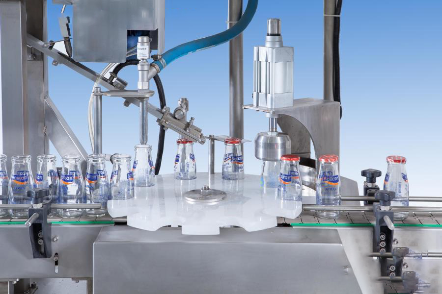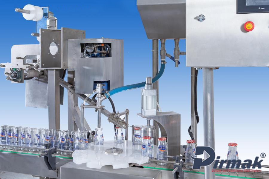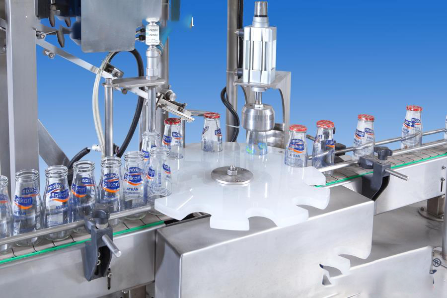Glass bottle filling and sealing machine works with a mechanical gearbox and a linear tracked system. It is possible to fill variety of glass bottle sizes. Filled bottles are capped at the lid station and sent to the output tray ready for packaging. Labelling and dating modules are also available as additions to the track if demanded. Glass bottle filling machine is suitable for filling ayran, milk, juice, lemonade etc.